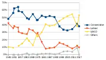 In 1945, the area saw as an unusual corollary to its shift southwards, the swing nationally, of +11.7% (Con-to-Lab) converted in the more strongly middle-class redefined seat to a major cut in the 24% Conservative majority [n 6] swinging −15.3% to a Liberal opponent, George Granville Slack. In February 1974 and from 1979 until seizing victory in 1997, the runner-up party became the Liberal Party or their successor, the Liberal Democrats and the ward boundaries became only slightly adjusted to reflect changes made in the borderlines made at the local level of government.
