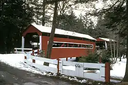 This historic structure is a 75-foot-long (23 m), Burr Truss bridge, with a sheet metal roof. Erected in 1850, it crosses the Huntington Creek and is one of twenty-eight historic covered bridges that are located in Columbia and Montour Counties. It is a twin of the Twin Bridges-West Paden Covered Bridge No. 121.[2]