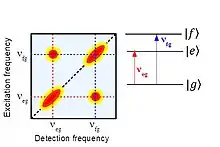 The peaks that stay out of the diagonal line are called cross peaks. These peaks appear when the system emits a signal that oscillates at a different frequency with respect to the signal used to excite. When a cross peak appears means that two electronic states of the system are coupled because when the pulses pump an electronic state, the system responds with emission from a different energy level. This coupling can be related to an energy transfer or charge transfer process between molecules.[4]