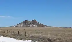 Two Buttes is a dual-peaked mountain in Prowers County, Colorado. The two peaks, which are the highest point in Prowers County, rise about 300 feet (91 m) above the mostly flat Great Plains that surround them, making them visible for miles. The south peak is about 30 feet (9.1 m) higher than the north one, and both are connected by a saddle.[3]