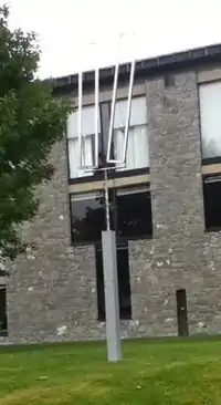 Two Open Rectangles, Excentric, Variation VI, is a public artwork by American artist George Rickey, located on the Middlebury College campus, outside of the Christian A. Johnson Memorial Building, in Middlebury, Vermont, United States. This kinetic sculpture of stainless steel consists of two rotating open rectangles attached with bearings on a u-shaped mount on an upright arm in a steel base. It measures approximately 12 feet high by 3 feet wide.