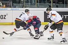 ![]() Johnson (center) with the United States national men's ice hockey team in 2014 | ||