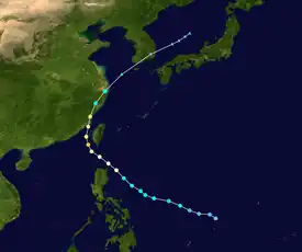 Typhoon Chebi was a powerful tropical cyclone that caused damage and deaths in five countries, the Philippines, Taiwan, China, South Korea, and Japan. The fourth depression, second named storm, and first typhoon of the 2001 Pacific typhoon season, Chebi formed from an area of convection that developed into a tropical depression southeast of Palau. The depression quickly strengthened into Tropical Storm Chebi six hours later. Chebi continued to move westward, passing over cooler waters, which caused Chebi to weaken, but it still maintained tropical storm status as it entered the Luzon Strait on June 23. In the Luzon Strait, Chebi encountered favorable conditions and began to re-intensify. By June 23, Chebi had reached Category 1- equivalent typhoon status. The storm continued to strengthen overnight, and by June 24, Chebi had reached its peak intensity. A trough of low pressure to the north of Chebi caused the storm to turn westward and then northwestward. That same day, Chebi made landfall near Fuzhou City. The storm then weakened rapidly as it moved inland, and by June 25, Chebi's remnants were over China. The remnants of Chebi continued to move northward, and on June 30, they dissipated.