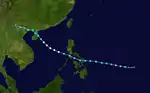Another surge from the easterlies, combined with the forty-fourth tropical wave of the season, began to develop off the east coast of Luzon in the Philippines on the morning of July 18. At the time, the tropical wave had winds of 15 mph (24 km/h) on its surface. The wave rapidly intensified during the morning and the Joint Typhoon Warning Center upped the system to a tropical depression the same afternoon. The next morning the system was upgraded to a tropical storm and received the name Kate. The new storm had a small, open eyewall which expanded during the day as the storm slowly intensified through and by the late morning of July 20, the storm became a typhoon with winds of 75 mph (121 km/h).[8] That morning, the eye had only a 12-mile (19 km) diameter and had similar surface winds. During the afternoon, the storm made a curve to the southwest from its track and looped back northward. By the morning of July 21, the storm began a northeastern turn towards Taiwan.[2]