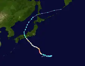 Typhoon Lan was a powerful tropical cyclone that struck central Japan in mid-August 2023. The seventh named storm and fifth typhoon of the 2023 Pacific typhoon season, Lan originated from an area of low pressure several hundred kilometers east of Iwo Jima. It initially tracked north-northwestward, gradually intensifying into a tropical storm and later to typhoon status, reaching its peak as a Category 4-equivalent typhoon with sustained winds of 215 km/h (130 mph) and a central pressure of 940 hPa (27.76 inHg). Lan then quickly weakened the following day due to the effects of inner ring of cloud tops and well-defined eyewall. Lan re-strengthened again to 155 km/h (100 mph), Lan made landfall near Cape Shionomisaki in Japan. Once inland, Lan rapidly weakened and degenerated into a tropical storm over the region's rough terrain. Lan emerged back over the southern Sea of Japan, before declared it an extratropical low on August 17. The low moved east-northeast and was last noted on the next day.