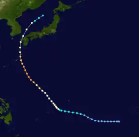 Initially, Tropical Storm Robyn meandered erratically within a mesoscale convective system.[2] At noon on August 3, the JMA upgraded Robyn into a severe tropical storm.[4] Banding features increased in coverage that afternoon as the storm itself slowed down. Early on August 4, the JTWC estimated that Robyn attained typhoon intensity, although operationally, this was believed to have occurred 12 hours earlier, when Dvorak intensity estimates supported an intensity of 120 km/h (75 mph). Robyn then began to cease all westward movement and instead took a dive south, only to turn north and later northwest.[2] According to the JMA, Robyn leveled off in intensity for 30 hours, and did not become a typhoon until noon on August 5.[4] Early on August 6, data from the JTWC suggested that Robyn entered a period of rapid deepening over 36 hours, ending winds of 235 km/h (145 mph). The JMA disagrees, noting that only slight intensification occurred during this period. On August 7, the JMA estimated that Robyn attained its peak intensity of 160 km/h (100 mph), with a barometric pressure of 945 mbar (27.9 inHg). Starting late on August 7, the JTWC estimated that Robyn began a weakening trend, although according to the JMA, Robyn maintained its intensity through August 8, with its pressure further dropping to 940 mbar (28 inHg)[7] After passing through the Ryukyu Island, Robyn skirted past western Kyushu on August 9 while steadily weakening.[3] Midday on August 10, both the JTWC and JMA agreed that Robyn lost typhoon intensity over the Sea of Japan.[7] The next day, both the JTWC and JMA classified the system as an extratropical cyclone.[2][4]