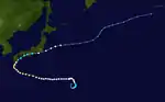 During January 8, the JMA started to monitor a tropical depression that had developed, about 500 km (310 mi) to the east of Ngerulmud, Palau.[3] Over the next day the system gradually developed further as it moved north-westwards, before it was classified as a tropical storm and named Sarah by the JTWC, after a US Navy plane had found an organised system.[3][4] The system subsequently recurved north-eastwards, before it was classified as a Severe Tropical Storm by the JMA during January 10.[5] During that day, the JTWC reported that the system had peaked, with 1-minute sustained wind-speeds of 95 km/h (60 mph).[4] Over the next day, the system quickly weakened and became an extratropical cyclone during January 11.[4] Sarah's extratropical remnants were subsequently tracked as they moved north-eastwards, until it made landfall on Canada and broke up over the mountains of British Columbia during January 17.[4]