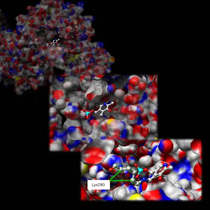 Tyrosine Aminotransferase as a dimer has two identical active site. Lys280 is attached to PLP, which is held in place via two nonpolar amino acid side chains; phenylalanine and isoleucine (see thumbnail on right). The PLP is also held in place by hydrogen bonding to surrounding molecules mainly by its phosphate group.