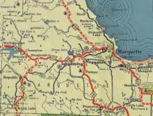 The 1927 edition of the official Michigan highway service map was the first to show M-28 extended along US 41 into Marquette County and east over the former M-25 through Munising and Newberry, before ending in downtown Sault Ste. Marie. At Negaunee, M-28 was shown along the previous routing of M-15 between Negaunee and Marquette for 10 miles (16 km), while US 41 ran along a portion of M-35.[27] This southern loop routing of M-28 lasted until approximately 1936, when M-28 was displayed as concurrent with US 41.[28] The former route is now Marquette County Road 492 (CR 492).[29] Around 1930, the northern terminus of US 41 was extended east from Copper Harbor to Fort Wilkins State Park.[30] Another realignment shown in 1937 marked the transfer of US 41/M-28 out of downtown Ishpeming and Negaunee. This former routing later became Bus. M-28.[31] The highway was realigned due north between Rapid River and Trenary according to the 1938 service map.[32][33] US 41 was completely paved in 1951. The final two sections to be paved were in Baraga County and Keweenaw County.[34]