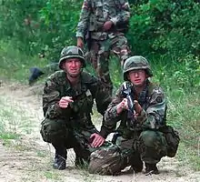 U.S. Army National Guardsmen on an exercise in 2000 while wearing Woodland BDUs and PASGT helmets