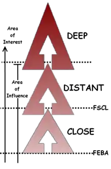 The units that provide distant reconnaissance (or known as "medium" reconnaissance) capabilities are usually organic to, or attached to regimental/brigade, division (military)-level, corps-level commands. It is usually directed toward determining location, disposition, composition, movement of supporting arms (i.e. artillery emplacement), and the reserve elements of the enemy committed forces.[1] Distant reconnaissance is conducted between the FEBA, beyond the FSCL,[2] to the rear of the commander's area of influence.[3] Dedicated scouts serving with infantry, tank, artillery, engineer, or logistics units will generally position themselves about 5 kilometres (3.1 mi) in advance of the forward units where possible.