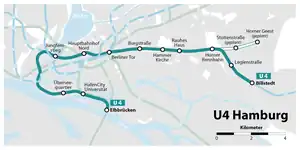 The U4 is a line of the Hamburg U-Bahn, which opened in 2012, serving 12 stations. It is the shortest line of the network, with a length of 11.9 kilometres (7.39 mi) and from Jungfernstieg to Billstedt it shares tracks with the U2.[1][2][3] Its identifying colour, as seen on route maps, trains, and station signs is turquoise.[4][5]