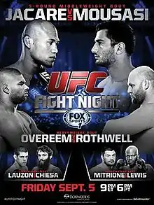UFC Fight Night: Jacaré vs. Mousasi (also known as UFC Fight Night 50) was a mixed martial arts event held on September 5, 2014, at the Foxwoods Resort Casino in Mashantucket, Connecticut.[2][3]