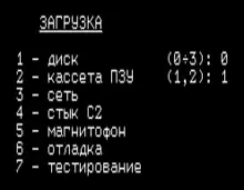 Boot menu of an educational computer UKNC. The screenshot was taken with the emulator UKNCBTL.