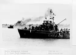 At the request of the United States Navy, in October 1965, she was alerted for service in South Vietnam and assigned to Coast Guard Squadron One in support of Operation Market Time along with 8 other Point class cutters.[11][12] While the crew completed overseas training and weapons qualifications at Coast Guard Island and Camp Parks, California, Point League was loaded onto a merchant ship, and transported to Subic Bay, Philippines arriving in January 1966 where she was refitted for combat service.[4] Shipyard modifications included installation of new single-sideband radio equipment, additional floodlights, small arms lockers, bunks, additional sound-powered phone circuits, and the addition of 4 M2 machine guns. The original Oerlikon 20 mm cannon was replaced with a combination over-under .50 caliber machine gun/81mm trigger fired mortar that had been developed by the Coast Guard for service in Vietnam.[3][4][13][14] For service in Vietnam, two officers were added to the crew complement to add seniority to the crew in the mission of interdicting vessels at sea.[15]