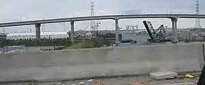During the night of 31 August 2008 or early morning of 1 September 2008, as a weak category-3 hurricane Gustav approached the coast of Louisiana, at least two clusters of ships were dislodged from their moorings and broke free. The Courier was shown in video coverage to be one of three vessel grounded on an embankment approaching the L & N railroad bridge near the I-10 'high' bridge.[6] On 3 September 2008, Joel Dupree of Southern Scrap Metal Corp. claimed the Courier has been removed from its position in front of the Almonaster Avenue Bridge and remoored at the scrap metal yard.[7][8] Dupree claims the Corps of Engineers were testing locks on the Industrial Canal at the Mississippi river that prevented moving the ships prior to Gustav, and that the Courier was properly anchored during the storm, however the level of the surge and winds were sufficient to break their moorings.[7] The USCG, however, said that it had recommended that ships double-up mooring lines prior to the storm.[6]