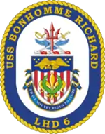 USS Bonhomme Richard (LHD-6) was a Wasp-class amphibious assault ship of the United States Navy commissioned on 15 August 1998. Like the previous five Wasp-class ships, Bonhomme Richard was designed to embark, deploy, and land elements of a Marine Corps landing force in amphibious assault operations by helicopter, landing craft, and amphibious vehicle, and, if needed, to act as a light aircraft carrier.