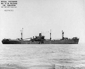 ![]() USS Cor Caroli (AK-91), broadside view, underway off San Francisco, 1 May 1943. | |