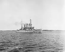 The keel for Montana was laid down at the Newport News Drydock & Shipbuilding Co. in Newport News on 29 April 1905. Her completed hull was launched on 15 December 1906, and after fitting-out work was completed, the new cruiser was commissioned into the United States Navy on 21 July 1908. She was assigned to the Atlantic Fleet and was transferred to Norfolk, Virginia. Montana steamed out of Norfolk on 5 August for a cruise off the eastern coast of the United States that lasted until 25 January 1909.[4] On 8 October 1908 she put on a searchlight display as part of a fireworks display at Philadelphia. During the display her searchlights blinded the operator of Philadelphia Police Department steamer Visitor that then had a slight collision with a barge that "Visitor" was going to, to help put out a fire on board caused by malfunctioning fireworks.[5] After a stop in Charleston, South Carolina, she continued south through the Caribbean Sea, arriving at Colón, Panama on 29 January. There, she joined the Special Service Squadron. This duty was interrupted twice;[4] the first came in February, when she returned to Hampton Roads, Virginia, where she and the rest of the Atlantic Fleet greeted the Great White Fleet at the conclusion of its circumnavigation of the globe.[6] The second came in April, owing to instability in the Ottoman Empire following the Young Turk Revolution that threatened American interests. Montana departed Guantanamo Bay, Cuba, on 2 April, when she was sent to the Mediterranean to protect Americans in the region. She remained there until 23 July, when she left Gibraltar, arriving in Boston on 3 August. She thereafter returned to her normal operations patrolling the eastern coast of the United States.[4]