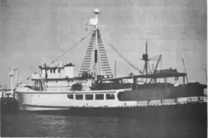 The Western Boat Building Company of Tacoma, Washington, registered the vessel as the 386-gross register ton (GRT) fishing boat MV Santa Rosa in 1951.[2] She was assigned the official number 261691.[21] She was listed as sold in 1952.[1] In 1956, Edward P. Silva of San Diego, California, registered her under the same name and with the same tonnage, but with the radio call sign WD5312.[2] In 1975, her tonnage was listed as 357 GRT.[2]