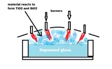 The way that ULE is made is very different from the standard way that glass is made. Instead of mixing powdered materials together into a batch, melting that batch and pouring out sheets of glass, ULE, being such a high temperature glass, has to be made in a flame hydrolysis process. In this process high purity precursors are injected into the flames, which causes them to react and form TiO2 and SiO2. The TiO2 and SiO2 then fall down and are deposited onto the growing glass.[1]