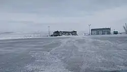 Due to the situation of the airport, the community and the surrounding hills there is a "wind line" about halfway to the airport. The funnelling effect of the hills may cause the airport to be in a blizzard while the community is enjoying clear weather or vice versa.