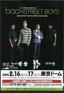 The Backstreet Boys' Unbreakable Tour was a 2008–2009 concert tour. This was their seventh concert tour in support of their sixth studio album Unbreakable (2007) and this was the first Backstreet Boys tour as a quartet without Kevin Richardson who left the group on June 23, 2006.[1] He did, however, join his band again at the end of the tour in Los Angeles.[2] Richardson later permanently returned to the group on April 29, 2012. The tour kicked off in Japan with two sold out concerts in the Tokyo Dome.