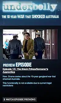 - ↑ "Victorians unlikely to see Underbelly soon". Australian Broadcasting Corporation. 30 May 2008. Retrieved 11 June 2008.