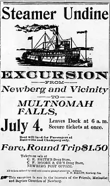 - 1 2 3 "The excursion from Newberg that went up the Columbia on the steamer Undine …", Oregon City Enterprise, Oregon City, OR: Chas. Meserve, vol. 25, no. 1, 5, col.4, June 26, 1891