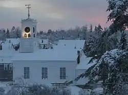 The early history of the church is shrouded in mystery; it was dedicated in January 1841, and its designer and builder are not known. The bell in the tower is original, and the clock was added in 1889. Use of the building for religious purposes had declined by the early 20th century to the point that it was deeded to the town, apparently with the stipulation that its exterior remain unaltered. It served as the community's town hall until 1987, and was further adapted for use as a gymnasium by the local schools in 1949-50. These functions were moved to a modern facility in 1987. The building has since housed the town library and archives.[3]