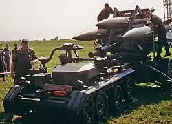 Still lacking an effective anti-aircraft system, the Army started development of two stop-gap systems that were meant to operate in concert. The M163 VADS combined the M61 Vulcan cannon, the M113 chassis, and an all-optical fire control system with a simple lead-computing gunsight. Suitable for "snap shots" against nearby targets, the VADS system was equipped only with a small ranging radar for the gunsight, its firing range being too small to justify a larger tracking radar. VADS was intended to operate in concert with the MIM-72 Chaparral, which combined the AIM-9 Sidewinder missile with a modified version of the M548 Cargo Carrier chassis. The Chaparral's AIM-9D missiles were capable of tail-chase launches only, but offered ranges up to 5 miles. Also using an all-optical firing system, the Chaparral nevertheless required the operator to "settle" the missiles on the target for a period of time to allow them to lock on, limiting its ability to deal with quickly moving targets. Both vehicles were optionally supported by the AN/MPQ-49 Forward Area Alerting Radar (FAAR), but this system was towed by the Gama Goat and couldn't be used near the front lines.[2] The pair of weapons was, at best, a nuisance to the enemy and had limited performance against modern aircraft.