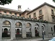 Portland's U.S. Custom House is a large edifice, encompassing a full block bounded by NW Broadway, Everett and Davis Streets, and Eighth Avenue, near the downtown. The four-story building is symmetrical, H-shaped in plan, featuring pavilions extending to the north and south from the central mass. An elegant one-story granite loggia of five tall, arched openings with rusticated walls and a scrolled parapet encloses the entry courtyard and opens onto Eighth Avenue and the North Park Blocks beyond.[1]