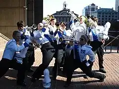 The instrumentation consists of piccolos, alto saxophones, tenor saxophones, trumpets, mellophone, trombones, baritones, sousaphone, and a variety of percussion instruments.[1]