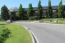 In response to the doubling of student enrolment over the past decade, the UTM campus building infrastructure has continued to expand to meet growing enrollment needs.[32][33] The construction of the Instructional Centre, also known as the Instructional Building (IB), had plans drawn out in 2002.[34] Located next to the Hazel McCallion Academic Learning Centre and Library on the north side at the end of the campus's outer circle road, the Instructional Building covers a total of 13,000 square metres (140,000 sq ft) of space spread out throughout its three stories. The much-innovated construction of the IB building is composed of green patinated copper strips aiming in a vertical direction continuing inside the building, adding to the physical appearance of the facility.[35] The use of the copper panels increases classroom space by 50% and increases the use of green infrastructure by 60%.[35][36] UTM's Instructional building includes geothermal heating and cooling systems under the nearby football field as well as awnings with thin photovoltaic cells which contribute to shade on the south side of the building.[35][36][37] Other renewable energy ideas were also included in the construction of the building such as the inclusion of green roofs and reflective membranes which play a big role in the reduction of urban heat as well as energy and water-efficient lighting and fixtures.[36][37] The building has been considered as a LEED silver-certified project and will soon be certified as LEED Gold. In addition, the building contains many windows, which enable much light to enter which creates a warm and friendly atmosphere for students.[32]
