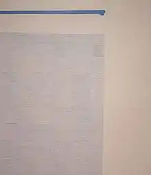 This large scale abstract, contemporary painting consists of beige paper mounted on canvas. A stroke of indigo blue paint is on the top of the painting, stopping 1/3 through. A series of blue ink squares, filled with lines, resides on a large portion of the canvas. This painting was acquired by The Broad on January 31, 1997.[1]