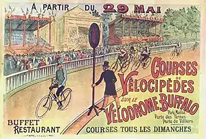 The Vélodrome Buffalo was not far from the Porte Maillot in Paris, at Neuilly-sur-Seine.[2][3][4][5] It had been built by May 1892, and originally had a track surface made from cement. The first races took place there on 4 June 1892. [1] On Monday 4 July 1892, Arthur DuCros, representing Ireland, won the ten kilometre scratch event for the Silver Buffalo Challenge Cup at this velodrome. DuCros won by a length from A.E.Good, of London. This race was a ten kilometre race between the British champions.[6]