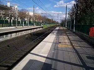 Le Vésinet–Centre station is a railway station in Le Vésinet, a suburb about 16 kilometres (9.9 mi) west of central Paris. Vésinet–Centre station uses a basic RER station setup with two tracks and two side platforms.