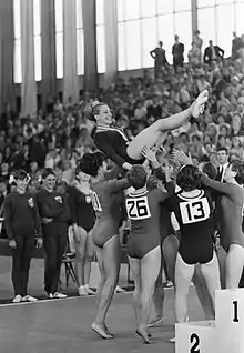 Věra Čáslavská (Czech pronunciation: [ˈvjɛra ˈtʃaːslafskaː]; 3 May 1942 – 30 August 2016) was a Czechoslovak artistic gymnast and Czech sports official. She won a total of 22 international titles between 1959 and 1968 including seven Olympic gold medals, four world titles and eleven European championships. Čáslavská is the most decorated Czech gymnast in history and is one of only two female gymnasts, along with Soviet Larisa Latynina, to win the all-around gold medal at two consecutive Olympics.[2] She remains the only gymnast, male or female, to have won an Olympic gold medal in each individual event.