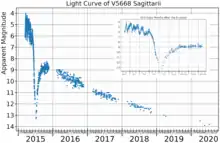 V5668 Sagittarii's peak brightness was followed by a series of fluctuations in brightness, then a strong decline of 7 magnitudes during June as the nova went through a dust formation phase.[4] The light curve for this event is very similar to the DQ Herculis intermediate polar, and it shows a coincident oscillation in X-ray flux with a period of 71±2 s due to rotation of the white dwarf. The white dwarf and its companion star are surrounded by a dusty shell of ejected material.[9]