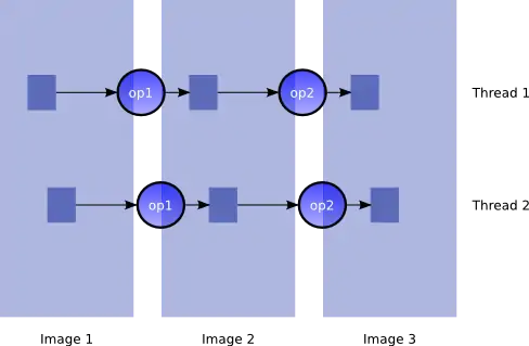 VIPS processes images in small portions (rectangles or groups of lines) and groups of operations are automatically run by separate threads. This makes the processing parallel because modern systems run the threads on different cores. It also means that image intermediates are small and can easily be stored in RAM. This is how multi-GB sized images can be processed on machines efficiently.[11] It also uses the smallest storage type for values, so a typical RGB image would use three one byte values but after arithmetic operations these scale up to avoid errors to 16 and 32 bit values. The demand-driven design means that if only a certain part of input images are required to compute what is needed, only the required parts are calculated. There are many architectural elements which give VIPS its speed[12] including its lack of locks and ability to overlap input and output. Most images start as three bytes per pixel (RGB) but when processing VIPS will upsize the elements to 16, 32 or 64 bits each if necessary to avoid clipping/rounding errors. This also contributes to the speed and low RAM use. Its demand-driven design means that, for example, a very large intermediate image may not be fully calculated if the output target requires just a small part of it.