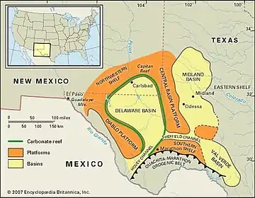 {{cite journal}}: Cite journal requires|journal=(help)CS1 maint: multiple names: authors list (link) - ↑ "Permian Basin | area, Texas, United States". Encyclopedia Britannica. Retrieved 2017-11-30.