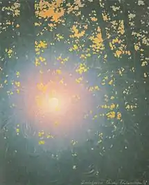 In 1894, he went to Paris to join his brother, Tyge, who was an art collector; then settled in Fontainebleau in 1896.[2] He continued his studies of light, producing a series of over thirty works with the sun's direct light as their theme; many depicting the sun as rises, shining through the trees. Sometimes, he would briefly stare at the sun, to recreate the lights and colors induced in his retina. He soon became known as the painter of the sun (Le peintre du Soleil).[2]