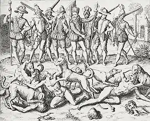 Balboa setting his dogs upon native practitioners of homosexuality (1594); engraving from the New York Public Library. The rendering was by the Flemish Protestant artist Theodor de Bry.