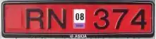 Temporary | RN 123 | Reflective red background, black frame, and black characters | Mainly used by dealers. This type of plates always starts with RN, the sticker indicates the validation year of the plate. |