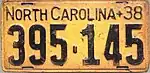 1938 | Embossed black serial on yellow plate; "NORTH CAROLINA–38" at top | none | 123-456 | 200-001 to approximately 646-000 | |