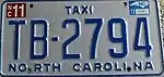 Taxi | 2006–present | Embossed blue on white with border line; "NORTH CAROLINA" at bottom; "TAXI" at top | TB-1234 | TA-1001 to present | Issued annually through 2005.[9] Issuing TC series as of August 19, 2019. |