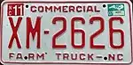 Farm Truck | Embossed red on white with border line; "COMMERCIAL" at top; "FARM TRUCK–NC" at bottom | WB-1234 XB-1234 YB-1234 |