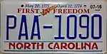 July 1, 2015 – present | Blue on reflective white with quill pen graphic | "First In Freedom" screened at top | ABC-1234 | PAA-1001 to RJR-4589 (as of December 9, 2023)[6] | Alternative issue. Includes dates of May 20, 1775 and April 12, 1776 commemorating the adoption of the Mecklenburg Declaration and Halifax Resolves, respectively.[7] Second letter in serials strictly A through M (so PMZ was followed by RAA, and RMZ will be followed by SAA). |