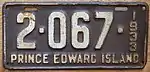 1943–44 | Embossed white serial on black plate; "PRINCE EDWARD ISLAND" at bottom; "1943" and provincial shield at left | none | 1-234 | 1-001 to approximately 7-900 | Revalidated for 1944 with windshield stickers, due to metal conservation for World War II. |