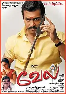 Vel (transl. Spear) is a 2007 Indian Tamil-language action drama film written and directed by Hari and produced by M. Chinthamani. It stars Suriya, Asin, Vadivelu and Kalabhavan Mani. Suriya plays a dual role as identical twins. The film also features Charan Raj, Nassar, Lakshmi, Saranya Ponvannan, Ambika in supporting roles.[1] The film's score and soundtrack was composed by Yuvan Shankar Raja.[2] Priyan handled the cinematography, while V. T. Vijayan handled the editing. The film released on 8 November 2007, coinciding with Diwali.